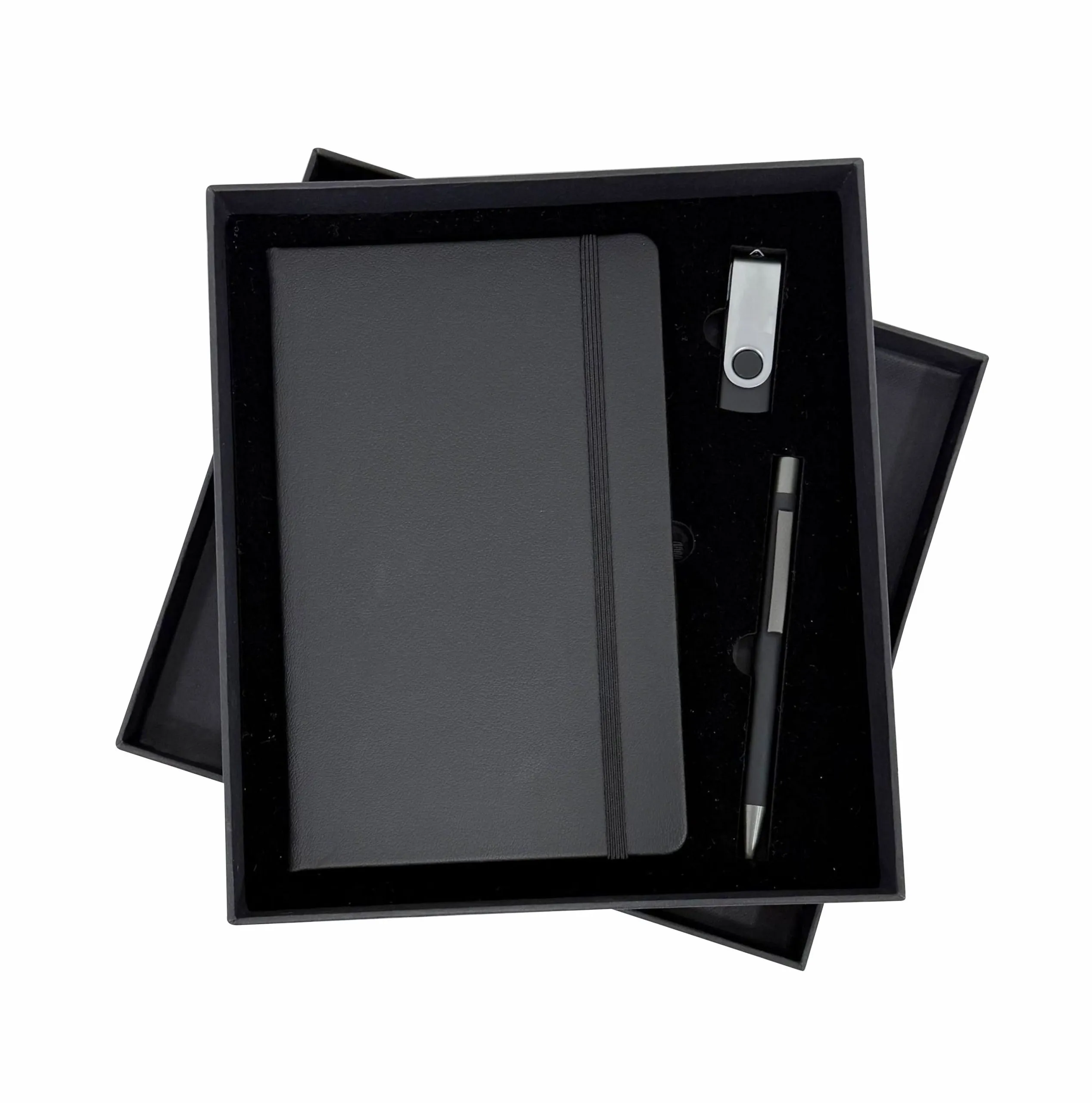 Dəstə daxildir 1 sm-lik bir qat floklu süngər, Bloknot BC45 qara, Yaddaş kartı F10 8gb qara, Qələm metal kod 012 qara