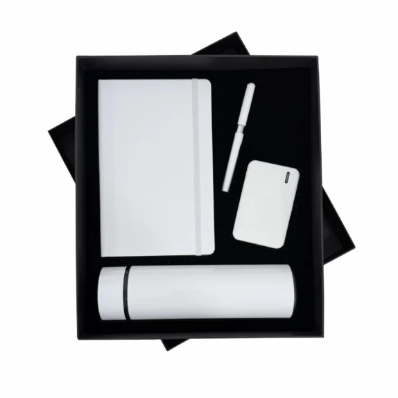 | Dəstə daxildir | Bloknot: B22 ağ, Termos:ağ, Powerbank: 5000 mah ağ, Qələm: metal 137 ağ, Ölçü: 28 x 32.5 sm |