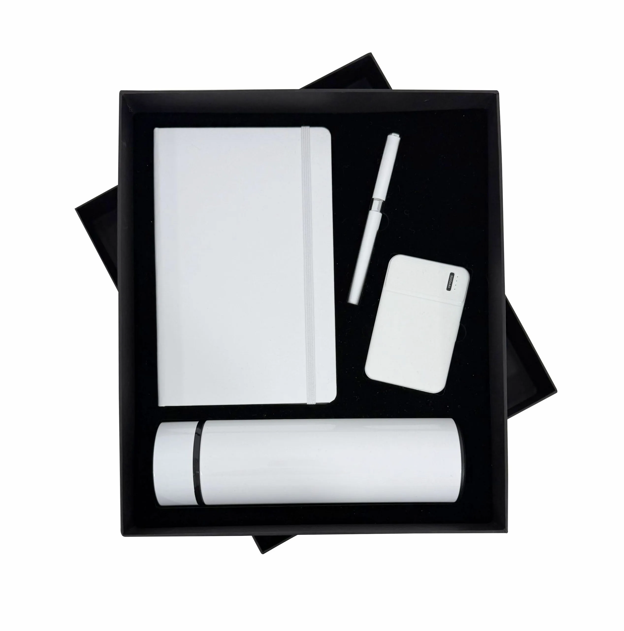 Dəstdə B22 ağ bloknot, 5000 mAh ağ powerbank, metal qələm (kod 137) və ağ termos yer alır.